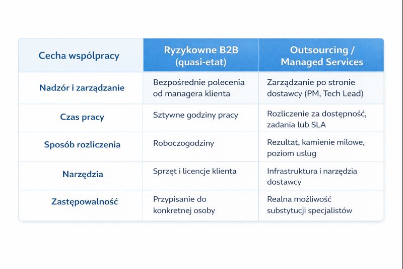 Poniższe zestawienie pokazuje różnice pomiędzy quasi-etatem w formule B2B a usługowym modelem outsourcingowym. Należy przy tym pamiętać, że ostateczna ocena zawsze opiera się na całościowym obrazie współpracy – żadne pojedyncze kryterium nie jest rozstrzygające.