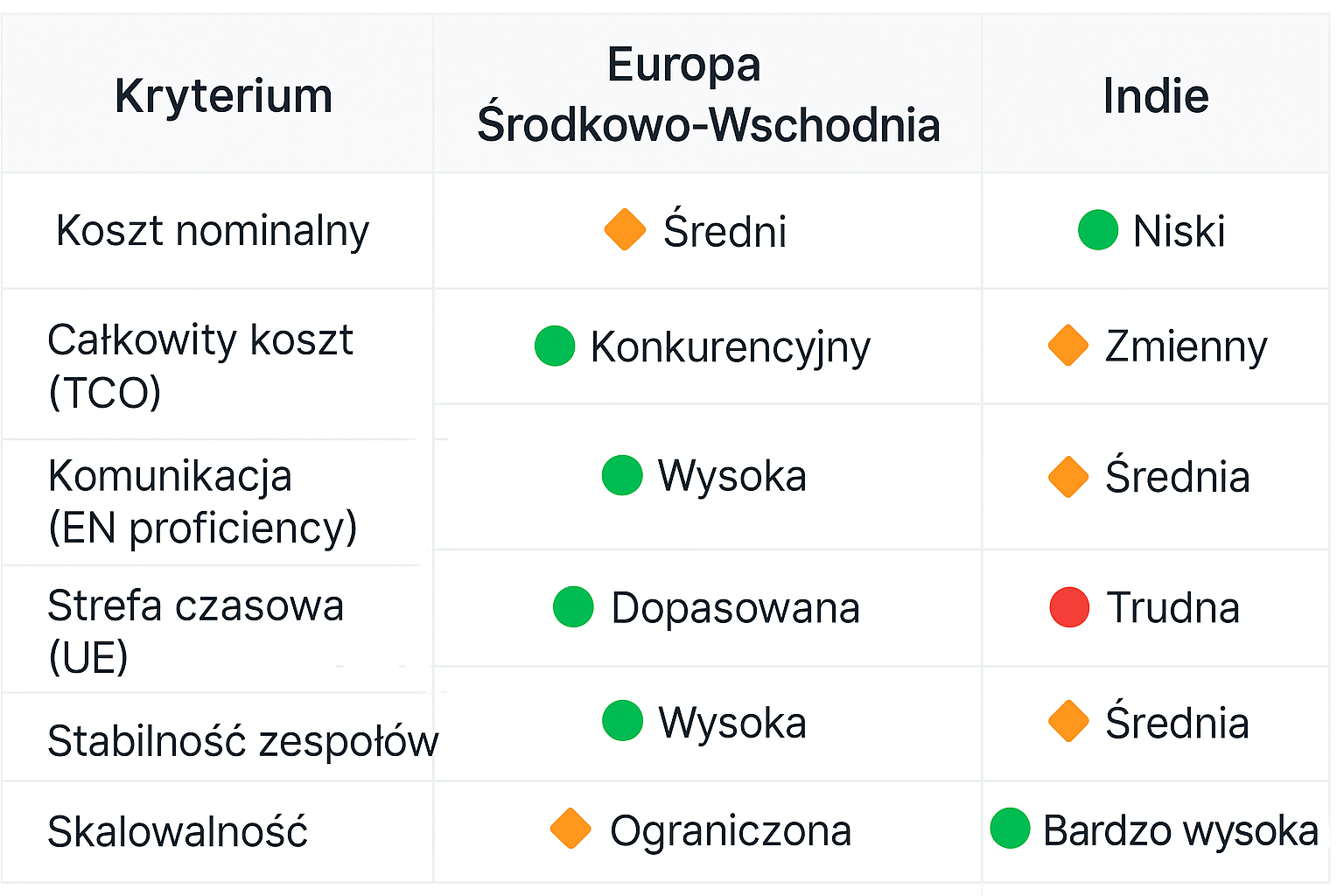 Nie ma jednego „najlepszego” kierunku outsourcingu. Wszystko zależy od celów biznesowych i charakteru projektu. Jeśli priorytetem jest skalowanie dużym wolumenem przy minimalnych kosztach nominalnych — Indie wciąż będą naturalnym wyborem. Jeśli jednak liczy się szybka komunikacja, jakość, zgodność z europejskim prawem i bliska współpraca produktowa — Europa Środkowo-Wschodnia wygrywa pod względem kosztoskuteczności.
